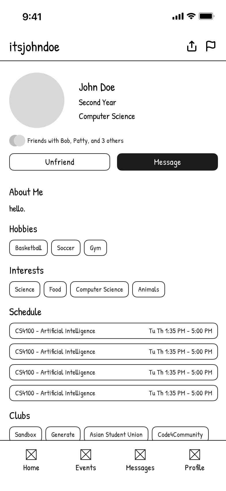 Users can host or join events, including those run by peers, clubs, or the school. They can see who’s attending, start conversations, and invite friends to go together. This makes events feel less intimidating since users can connect beforehand or get familiar with who will be there, though it does raise a tradeoff between privacy and familiarity.